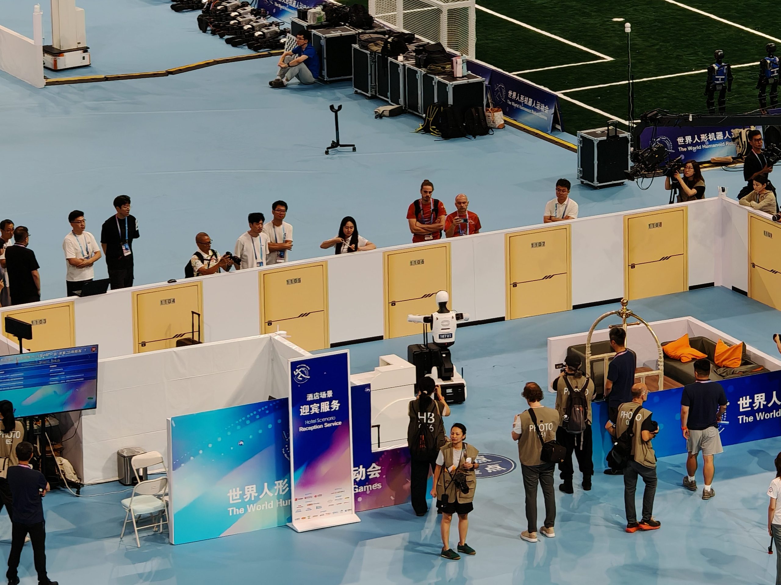 日本でも試合の様子がニュース映像となったロボット・サッカーもそうだ。3対3、5対5で行われたサッカーはすべて中国のロボット企業Booster Roboticの筐体を使っている。対戦する各チームは、ロボットの自己位置推定や認識、戦術などAIを中心としたソフトウェアの優劣を競う。つまりこの競技はエンボディドAIの開発を競うものだ。AIにより、自律的に試合を進めるロボットに目を見張る一方、試合中にロボット同士がぶつかって倒れ込み、試合続行のため、それを人がフィールド外に引っ張り出す場面も。
