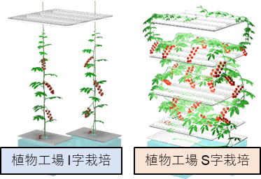 今回の研究では、ミニトマトの茎を垂直に伸ばして1本のワイヤに誘引し、上部からLEDを照射する「I字栽培」(従来ある手法)に加え、茎を水平に曲げながらS字状に多段の棚に誘引して、各層の側面からLEDを照射する「S字栽培」を開発・採用した。この「S字栽培」がブレイクスルーの大きな要因になったという。